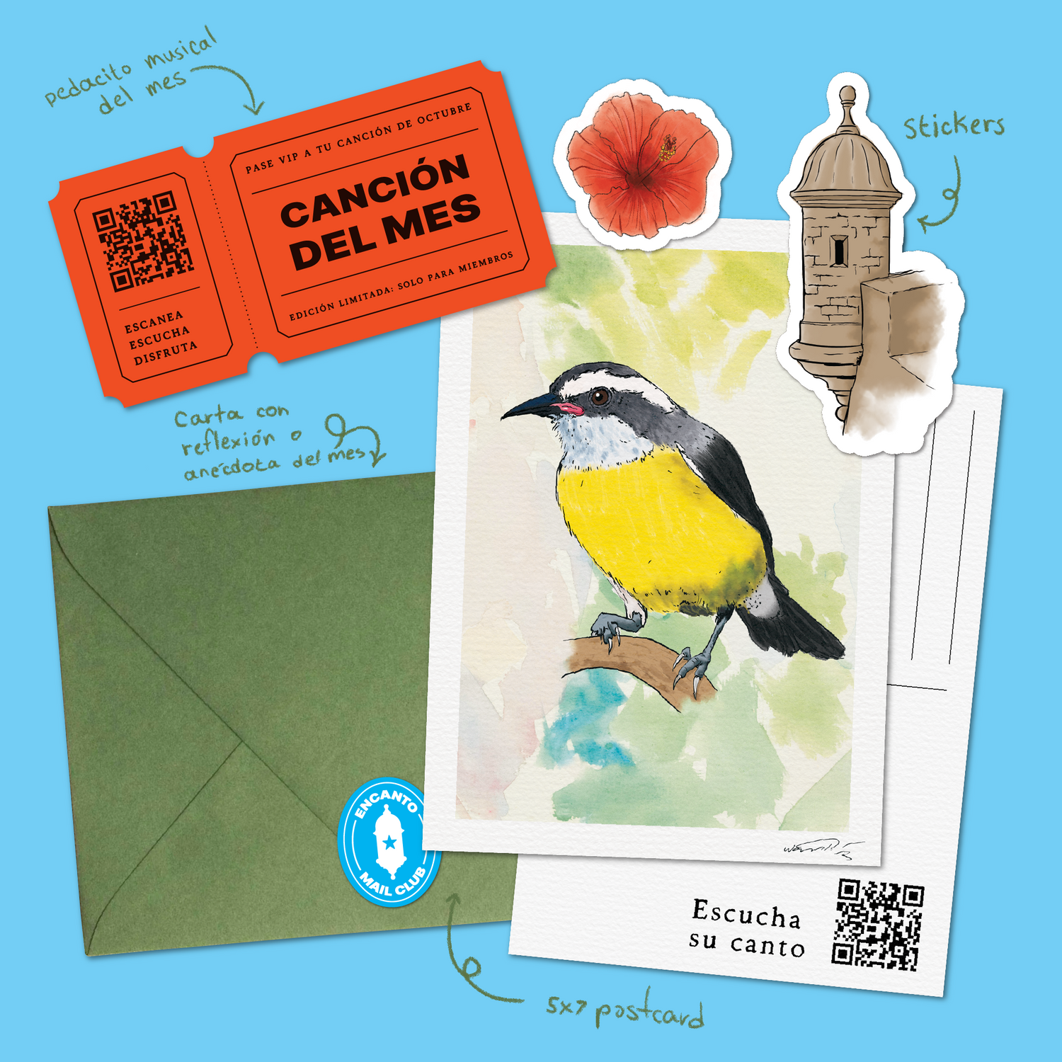 Cada mes recibes una postal ilustrada 5x7, una canción original, una carta con reflexión y stickers inspirados en Puerto Rico.